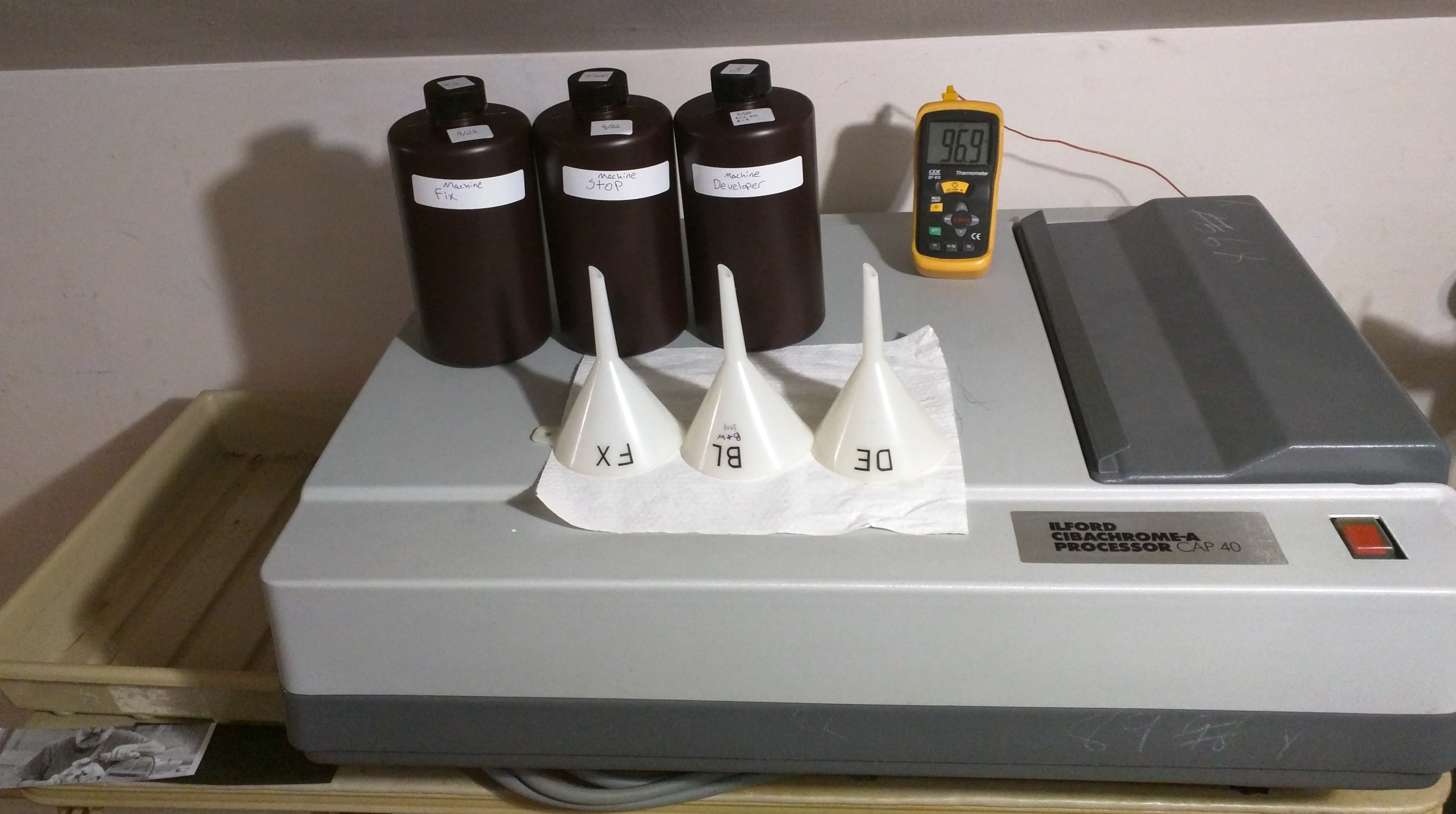 I had a bit of an issue. The only room in my house which is easily used as a darkroom, is on the opposite side of the house from the rooms with running water. This left me with a couple options: Save up my prints in a water bath and wash them all at once, or carry dozens of gallons of water in 5 gallon buckets back and forth across the house and spend most of my time doing that, rather than printing. I attempted the former, but I would lose track of time, and my RC paper would tend to swell and start to separate from the base.